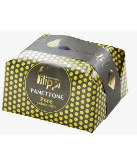 Naturally leavened oven-baked confectionery product without raisins.An extraordinary interpretation by Filippi of a "great classic": drops of dark chocolate mixed with soft and tasty pieces of candied pear. The classic mixture of flour, eggs, butter, whole untreated vanilla beans from Madagascar and a soft and sweet heart with many pieces of candied pear and chocolate chips ... In short, a delight!