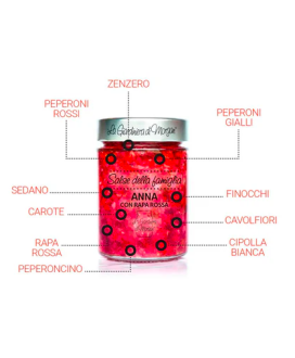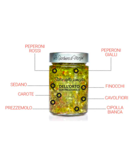 ortaggi in proporzione variabile: (carote, finocchi, SEDANO, cavolfiori, peperoni rossi, peperoni gialli, cipolla bianca), olio di semi di girasole, olio extravergine d'oliva, aceto di vino Bianco, acqua, sale marino integrale di Cervia, zucchero.